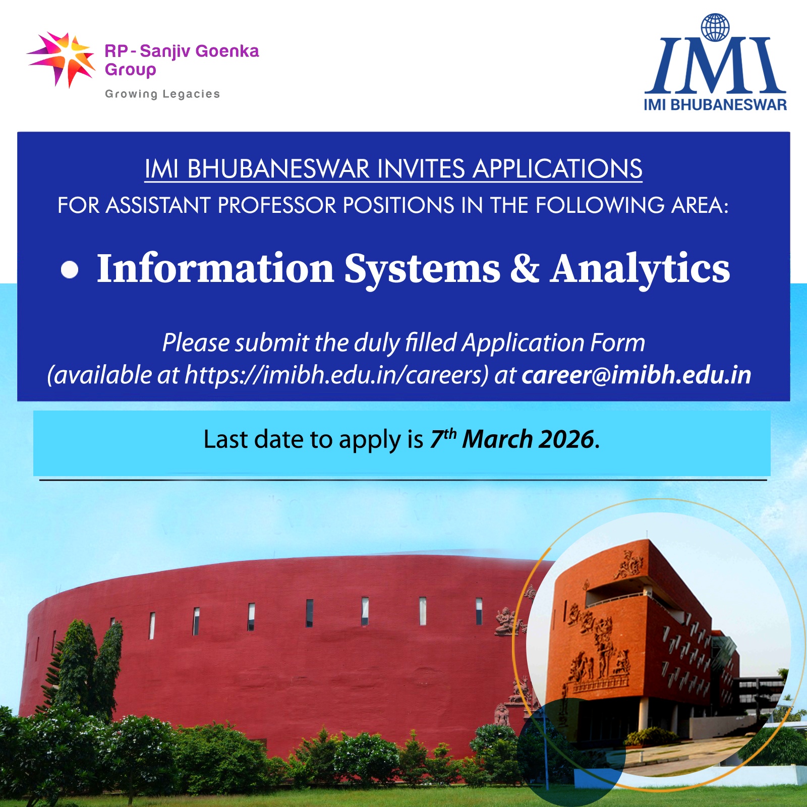 IMI Bhubaneswar, established in 2011. IMI Bhubaneswar currently offers Post Graduate Diploma in Management (PGDM),Post Graduate Diploma in Management Online(PGDM Online) and FPM (equivalent to PhD) programmes which are approved by AICTE. The flagship PGDM programme is accredited by AMBA (Association of MBAs); NBA (National Board of Accreditation); NAAC (National Assessment and Accreditation Council); and has received equivalence from AIU (Association of Indian Universities). IMI Bhubaneswar draws sustenance through creation; dissemination and application of knowledge which integrates seamlessly with each other to translate into research, teaching and training for our stakeholders. Nested in an ecologically invigorating ambience and sculpted by a renowned architect, IMI epitomizes a “gurukul.”